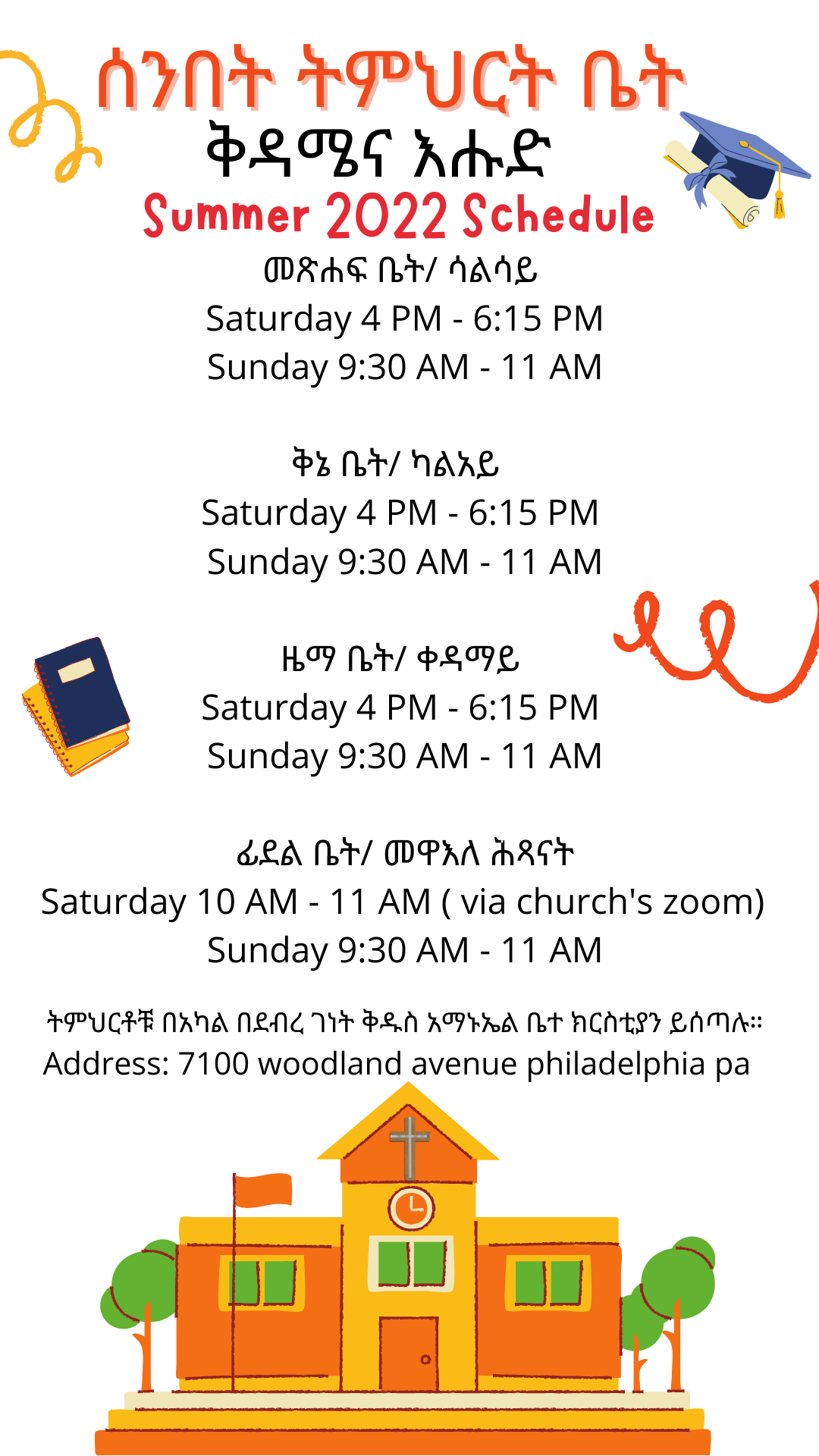መደበኛ የወንጌል ትምህርት ዘወትር ቅዳሜ ከ 5 pm ጀምሮ እስከ 7 pm ፣ እንዲሁም እሁድ ከቅዳሴ በኋላ